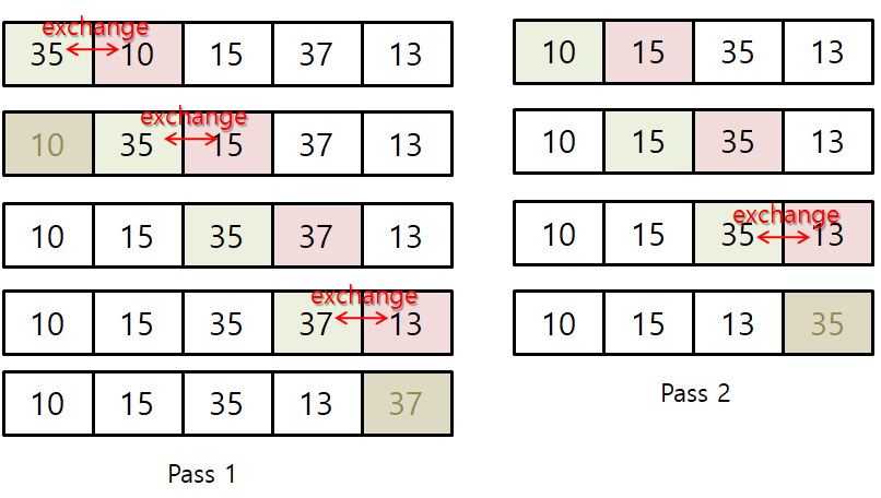 - 그 값을 맨 앞에 위치한 값과 교체한다.( 패스(pass))
