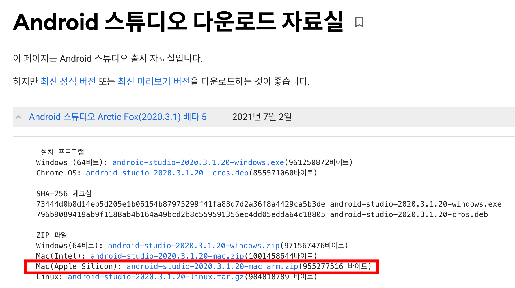 Android 스튜디오 다운로드 자료실에 가장 상단부터 M1이 지원하는 버전이 출시 되었는지 확인합니다.