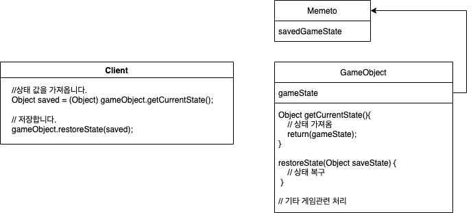단일 역할 원칙(single reponsibility principle) 의 원칙을 지키면서 메멘토 패턴을 바라본다면, 저장하고자 하는 상태와 핵심 객체를 분리하여야 합니다. 여기서 상태를 따로 저장하는 역할을 맡은 객체를 메멘토 객체라고 부릅니다.