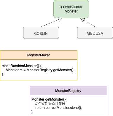 생성과정을 캡슐화 할 때 프로토타입 패턴을 활용하시면 됩니다. 클라이언트가 현재 상황에 맞는 새로운 몬스터를 원할 때 레지스트리에서 적당한 몬스터를 찾아서 clone으로 만들어 제공하면 됩니다. 이렇게 되었을 시 클라이언트는 몬스터의 종류를 알 수 없이 원하는 몬스터를 가져올 수 있습니다.