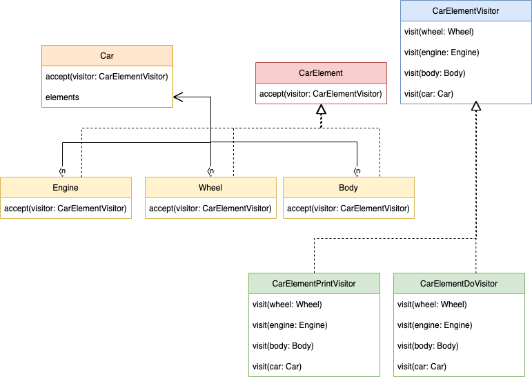 비지터 객체에서 처리 할 수 있도록 인터페이스를 생성합니다. CarElement에서 Accept(CarElementVisitor) Fuction 호출로 비지터 객체어 접근할 수 있도록 구성합니다.