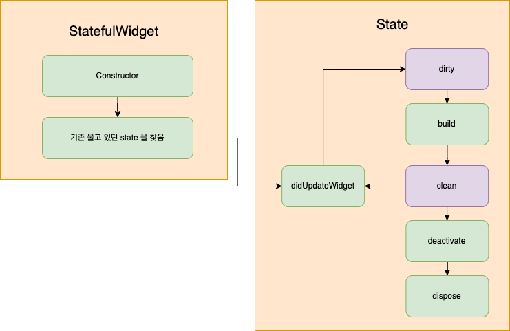 파라미터가 변경하게 되면 기존 위젯이 존재하여도 위젯은 새로 생성됩니다. 그후 생성된 state 를 찾아서 재사용하는데 이때 didUpdateWidget을 호출합니다. dirty build clean 순으로 업데이트가 됩니다.
