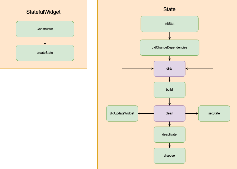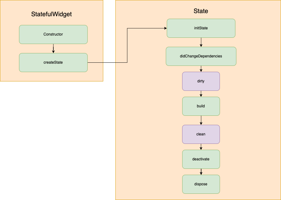 기본적인 Stateful Widget 의 LifeCycle입니다. 아래 Flow 를 보면 StatefultWidget이 State 를 생성하는 것을 알 수 있습니다.