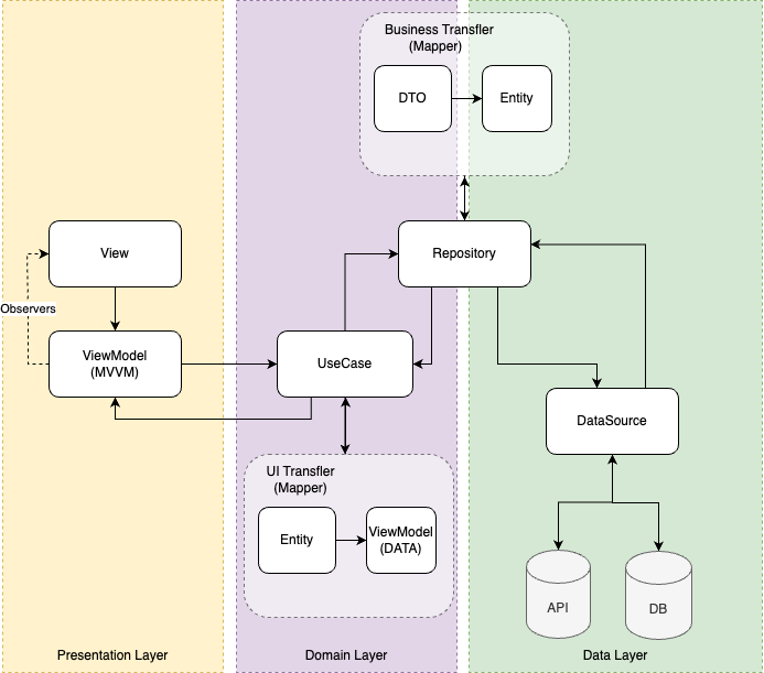 API 에서 받은 DTO 를 바로 사용하는 구조라면 entity에서 ViewModel의 mapper의 역할도 고려해 볼 필요가 있습니다. 프로젝트에 API 구조에 따라서 DTO를 바로 사용할 수도 있고, Mapper를 활용해서 DTO에 대한 비즈니스를 녹인 Entity 로 사용할 수 있습니다.