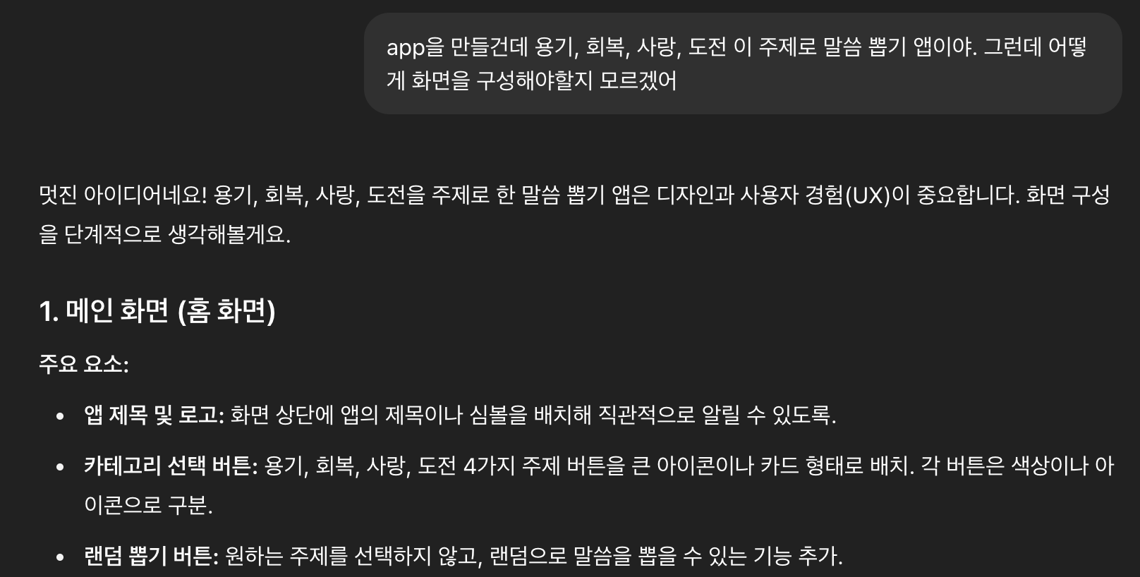 AI 의 프롬프트는 웹 브라우저의 검색과 다르게 문장으로 프롬프트를 작성할 수록 좋은 피드백을 받을 수 있습니다. 그래서 저의 첫 프롬프트는 AI 에게 ‘개발하고자 하는 앱의 배경과’과 ‘앱 화면 구성 방법’ 에 대해서 질문을 하였습니다.