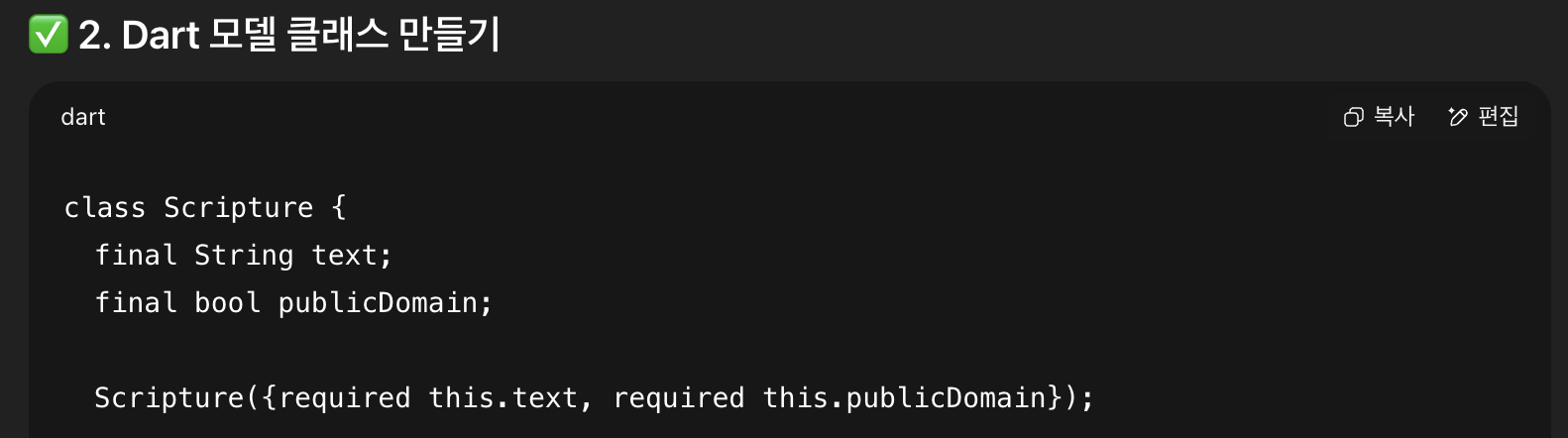 JSON 파싱 시 필요한 Dart 모델 구성과 JSON 파싱 방법을 코드로 알려주어 적용하는데 어려움이 없었습니다.