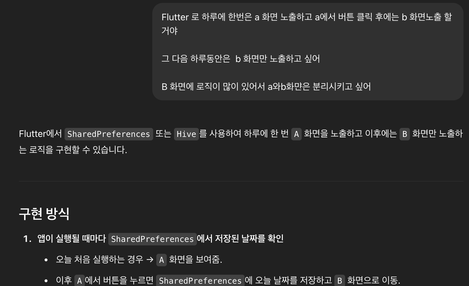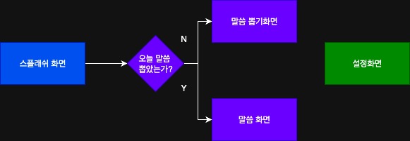 스플래시 화면을 구성하고, '오늘의 말씀'을 보여주었는지 여부에 따라 서로 다른 엔드포인트 화면으로 이동할 수 있도록 로직을 만들 계획을 갖고 프롬프트에 입력하였습니다.