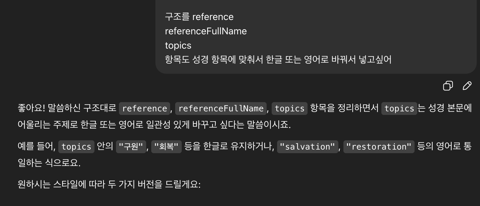 여기서 더 나아가 JSON 구성도 변경할 수 있습니다. reference, referenceFullName, Topics 와 같이 필드를 추가해서 변경해달라는 프롬프트를 작성하였고, AI는 의도에 맞게 JSON을 재구성하여 제공하였습니다.